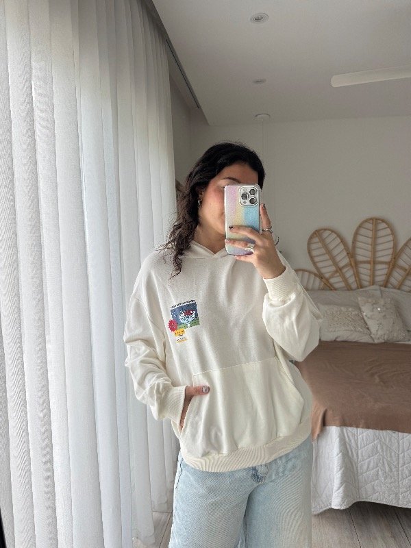 Buzo canguro con bolsillos y estampa delantera y trasera, sin frisa